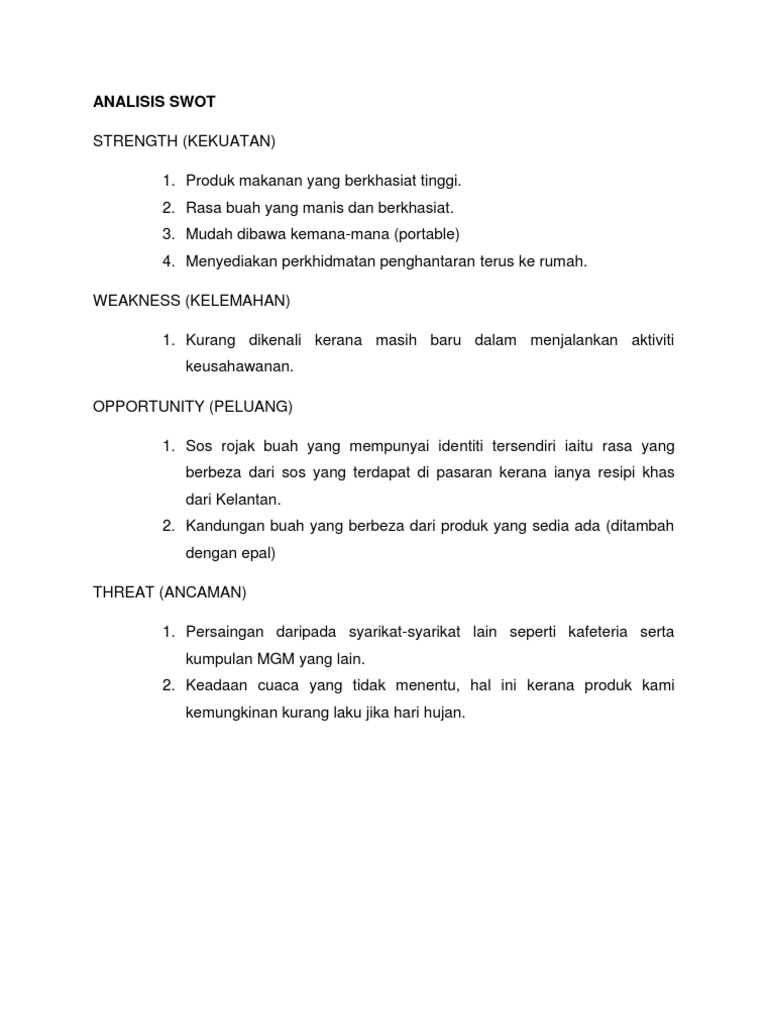 Sebenarnya analisis swot tidak hanya melulu dalam hal strategi bisnis, anda bisa menggunakan dalam konteks organisasi atau perorangan, misalnya dalam bidang karir. Tujuan dan manfaat analisis swot. Semua contoh analisis swot kami adalah berdasarkan kepada perniagaan sebenar yang kami tampilkan di galeri rancangan perniagaan contoh percuma kami. Menawarkan tidak mempunyai peluang perniagaan mempunyai. Makalah materi analisis swot (strengths, weaknesses, opportunities, dan threats) beserta pengertian, manfaat, cara membuat, unsur & contohnya.