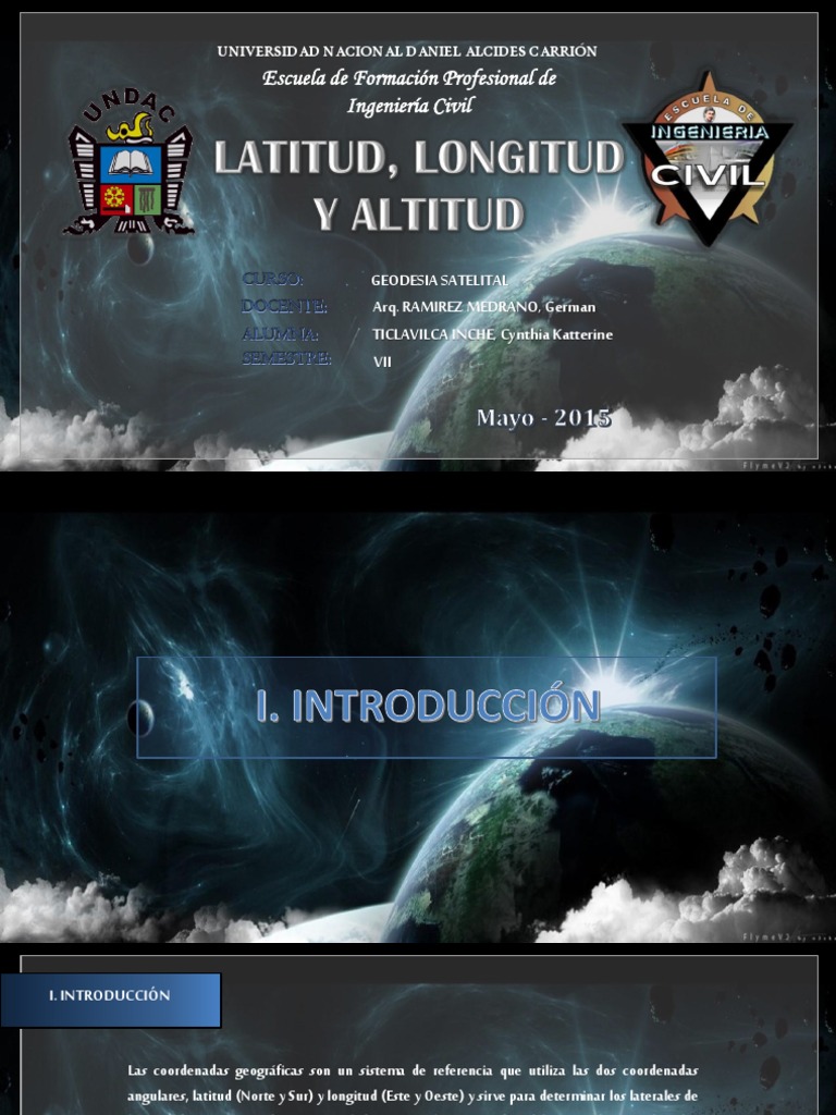 Las coordenadas geográficas suelen presentarse en varios sistemas o formatos. La latitud, longitud y altitud son las coordenadas geográficas que permiten ubicar cualquier punto de la esfera terrestre. La altitud es la distancia vertical de un lugar, medida a partir del nivel del mar. Concepción copiapó coquimbo iquique la pintana la serena los ángeles osorno puente alto puerto montt punta arenas quilpué rancagua san bernardo santiago de chile talca talcahuano temuco valdivia valparaíso viña del mar. Paz arenas, edward ronaldo ramos supo, rony sahuaraura arqque, harrison david. La longitud tiene el mismo principio, con la diferencia en que no existe una referencia natural como lo es el ecuador para la latitud. Sin embargo en navegación marítima son muy utilizadas, piense que en la inmensidad del mar no hay referencias visuales. Así, diez grados en latitud norte podría representarse 10°n ó +10°; Conoce todo sobre la altitud latitud y longitud de nuestra tierra. distancia vertical de un plano horizontal hasta el nivel del mar unidades (m.s.n.m). La longitud es la medida del primer meridiano, una línea de longitud va entre los polos y a través de greenwich, inglaterra. Se mide a partir de 0°, que corresponde al ecuador, en dirección norte o sur, usando los paralelos. La tierra no es una esfera, pero de forma irregular aproximación de un elipsoide.